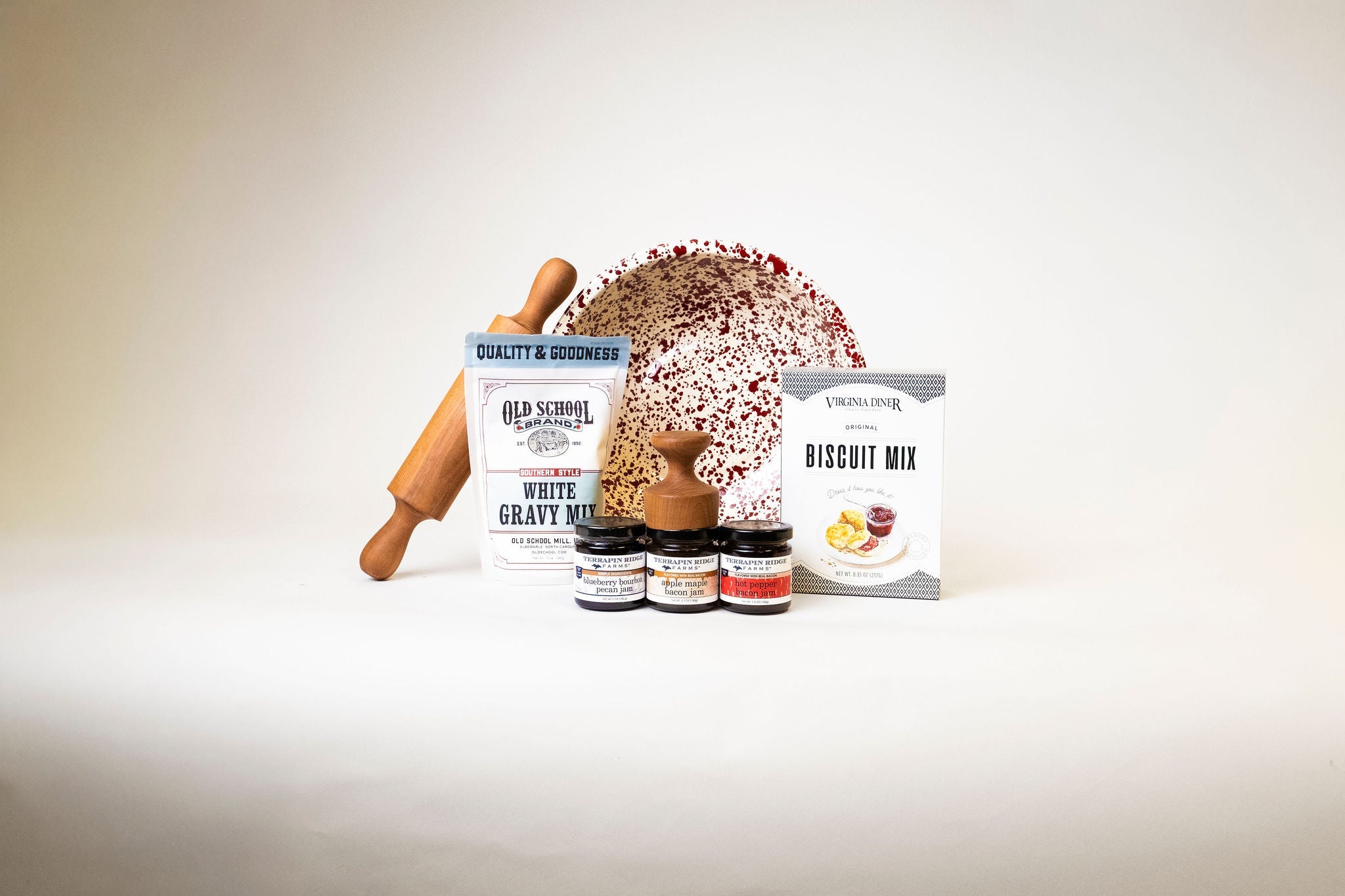 Experience the charm of traditional country cooking with our curated set, featuring a Crow Canyon Enamel Basin, Virginia Diner Biscuit Mix, Old School White Gravy Mix, and an assortment of Terrapin Ridge Jams. Complete with a sturdy rolling pin and biscuit cutter, this collection offers everything you need for a classic homemade meal. Perfect for gifting or enjoying yourself, this set brings together timeless kitchen essentials and delicious flavors. Order now to add a touch of nostalgia to your kitchen.