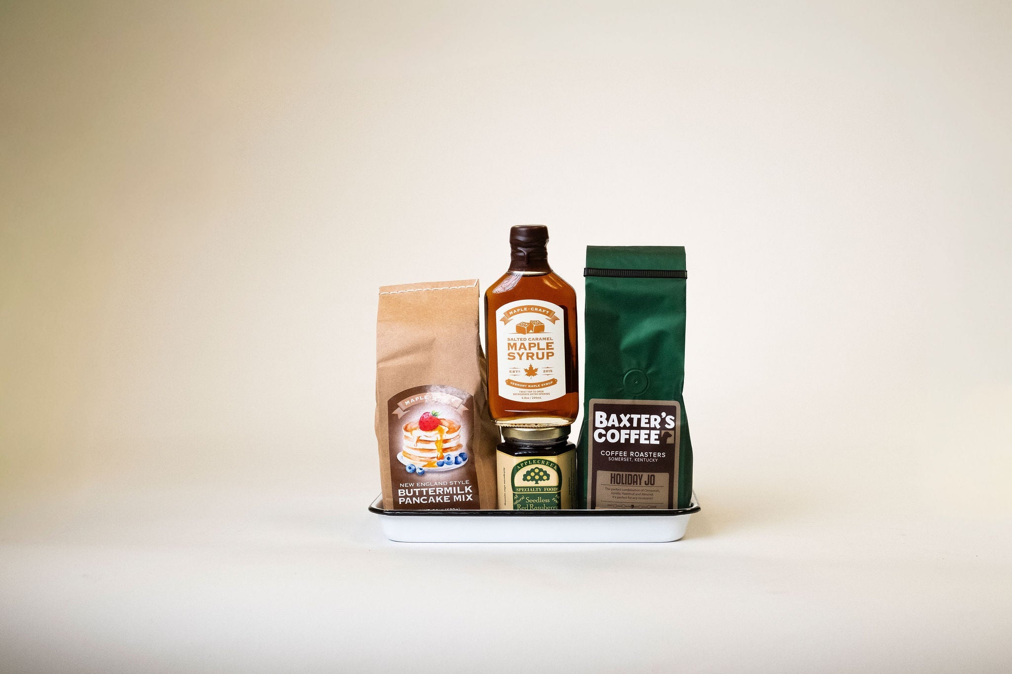 This gift is beautifully presented on an enamel baking tray and includes Maple Craft Buttermilk Pancake Mix, paired with Pure Vermont Syrup for a classic pancake breakfast. Complement your meal with Apple Creek Seedless Red Raspberry Jam for a burst of fruity flavor, and enjoy Baxter’s Bluebird Blend Coffee for the perfect morning pick-me-up.